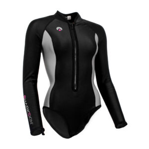 Le nouveau haut « step-in » peut être porté seul ou sous une combinaison pour une protection supplémentaire contre le froid et le vent. Le design unique à enfiler est non seulement superbe, mais empêche le haut de remonter afin que vous puissiez le porter seul sans avoir à porter des shorts ou des slips séparés. Il est doté d’un col pour vous aider à garder votre cou au chaud et les manches longues offrent une protection supplémentaire contre le froid et le soleil. Les languettes pour les pouces à l’intérieur des manches aident à enfiler une combinaison par-dessus.